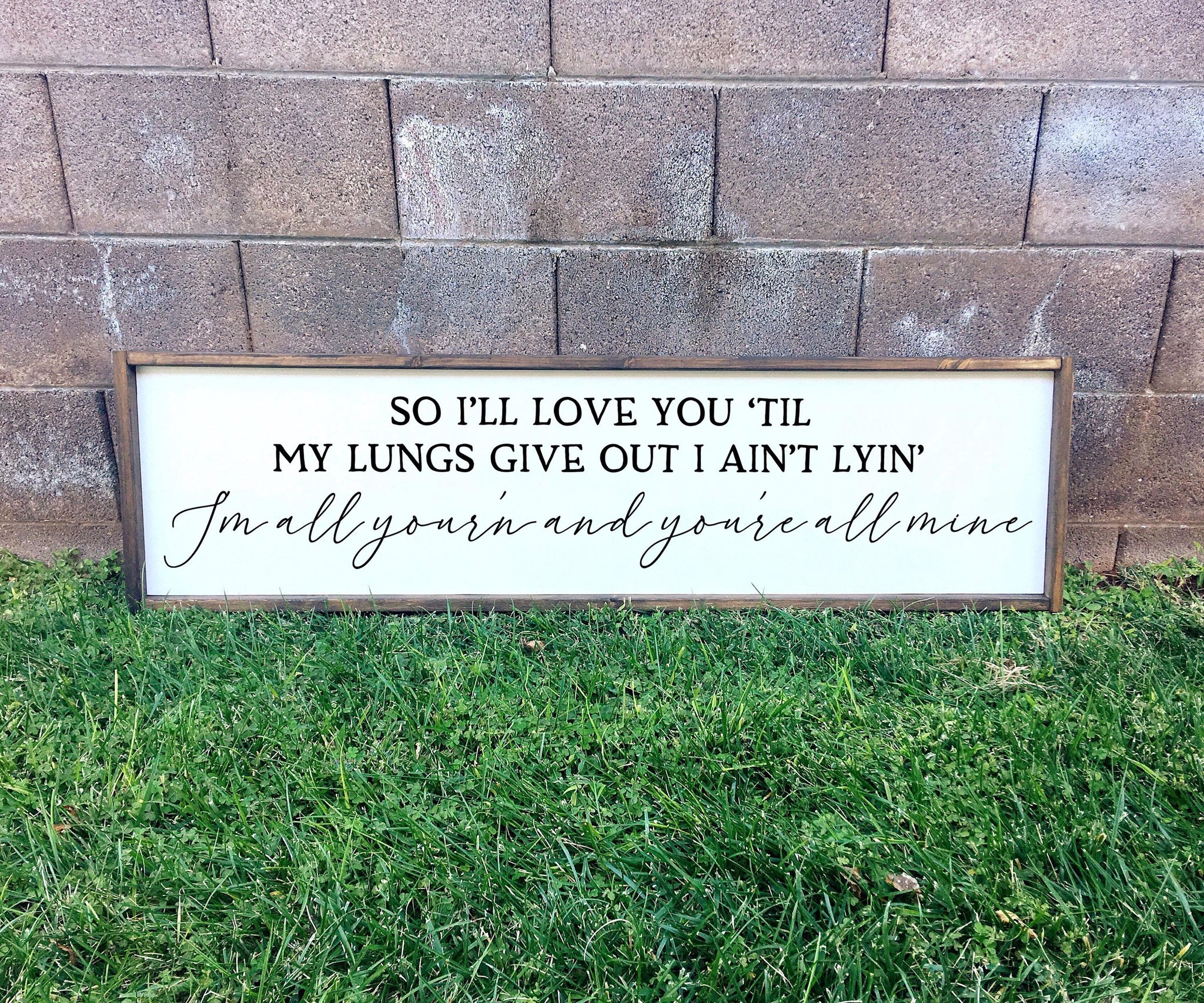 Ill love you til my lungs give out I ain't lyin' I'm all your'n and you're all mine | framed wood sign | Wall art | Above the bed wall decor